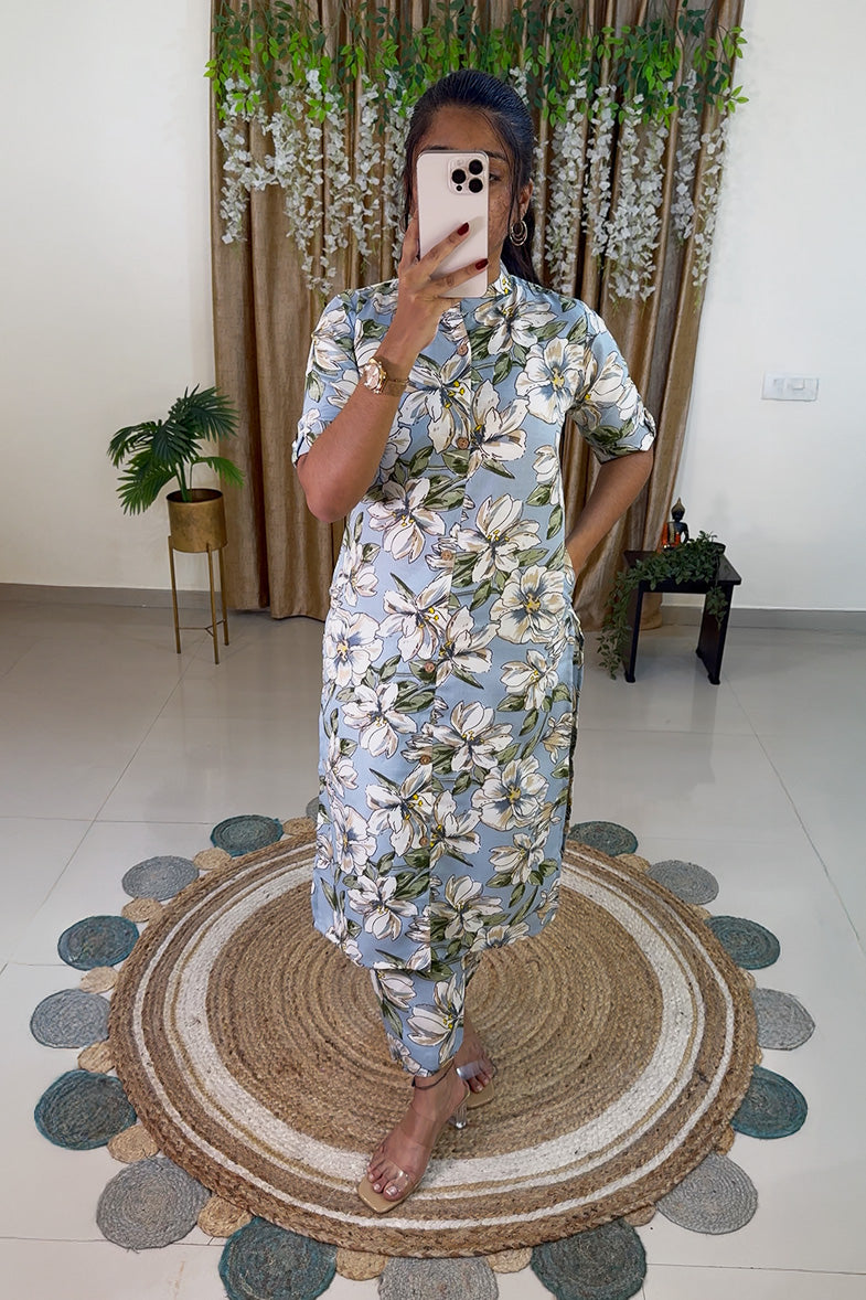 This co-ord set features a floral printed, straight-cut cotton top with side slits, paired with a matching high-waist bottom for a polished yet breathable look.